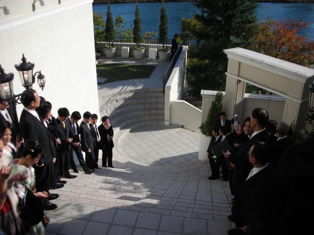 次は屋外の階段でフラワーシャワー。「大階段」といいますがあなた、ずいぶん狭くて急な階段ですね。
