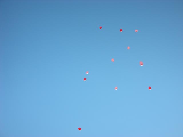 入刀の瞬間にプールに浮かんでいた風船が割れて中に入っていた小さな風船が一斉に空に飛んでいった。