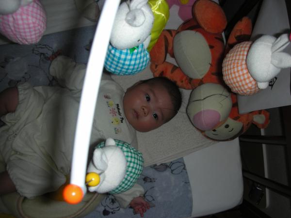Kはるはだいぶいろんなものを目で追うようになってきた。ベッドの上で回るメリーさんも一生懸命追いかけていて眠る様子がない。