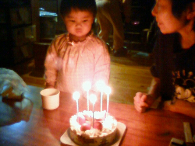 夜はケーキ。Kはるがろうそくの火を吹き消した。