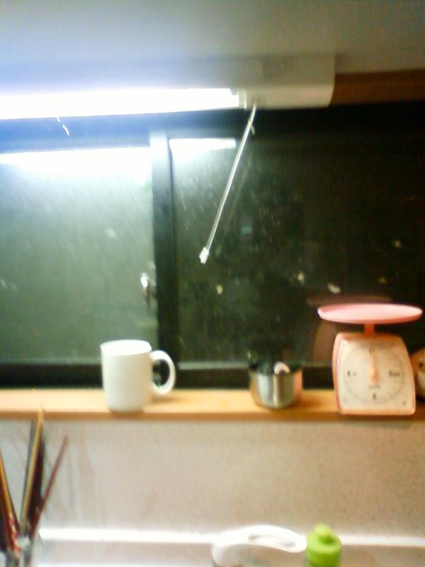 台所の蛍光灯のヒモが重力と戦っていた。