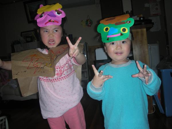 子供達は自作のお面をかぶって準備万端とのこと。