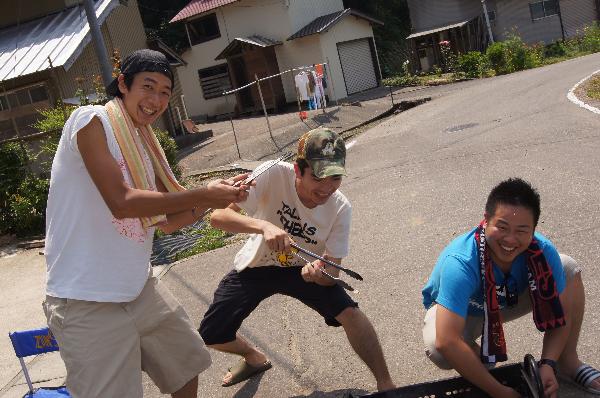 男達の肉も焼けた。あちい。