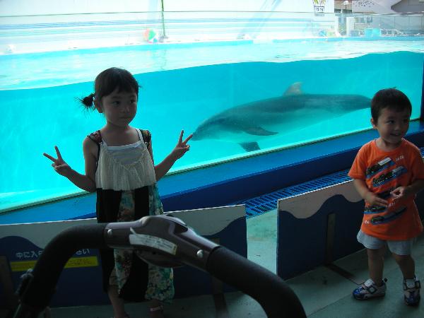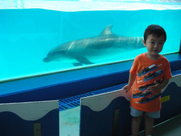 待ってる間にイルカが水槽を行ったりきたりしているタイミングを計って2ショット。