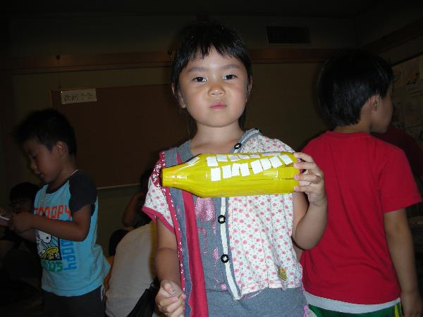 ペットボトルにビニールテープを貼って新幹線にする。