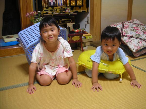 風呂上りは何が楽しいのか洗濯籠をしょったり、浮き輪をしたり。