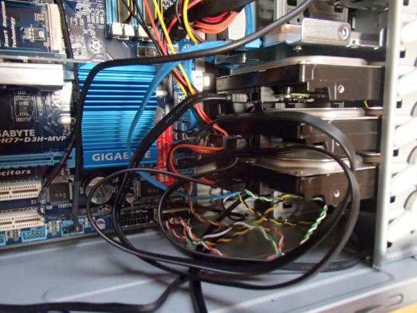 3.5インチベイは一番上はSDカードとかのメディアをさすやつで、2番目の薄っぺらがCドライブでSSD、HDDは500GBが2台と、320GBが1つ。