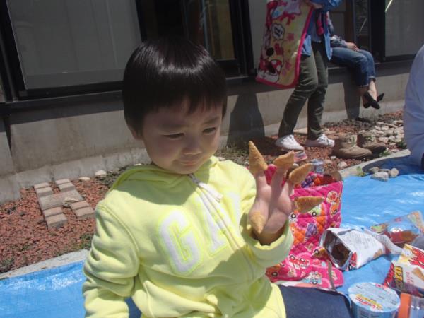 おやつにとんがりコーンがあったんだけど、手にはめると言う典型的な遊びをする子供たち。