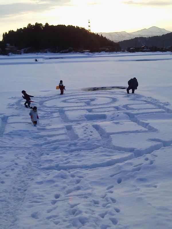 パパとママとTなつは畑で雪の迷路を作って遊ぶ。