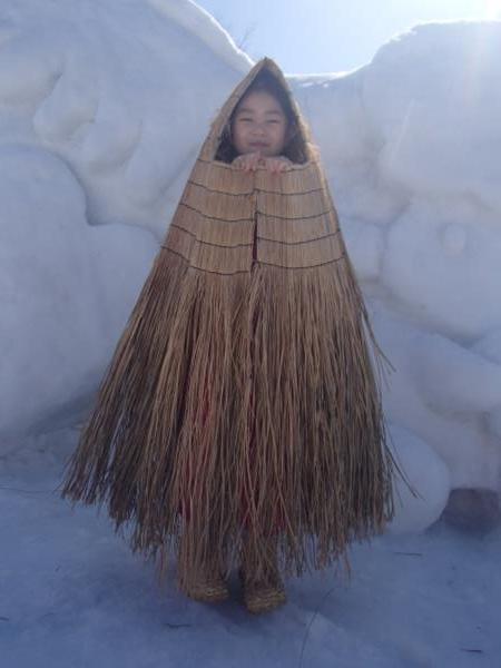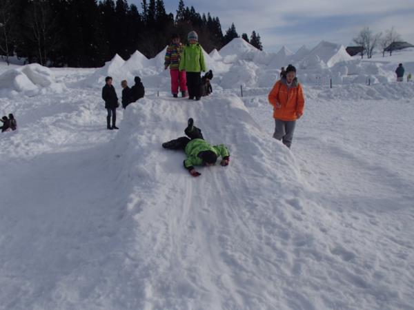 その駐車場からしてすでにかまくらとか、雪像、昔の竹のスキー・そり、わらの服(?)、雪かきセット、とかあり、子供たちは次から次へと遊ぶのに余念がない。